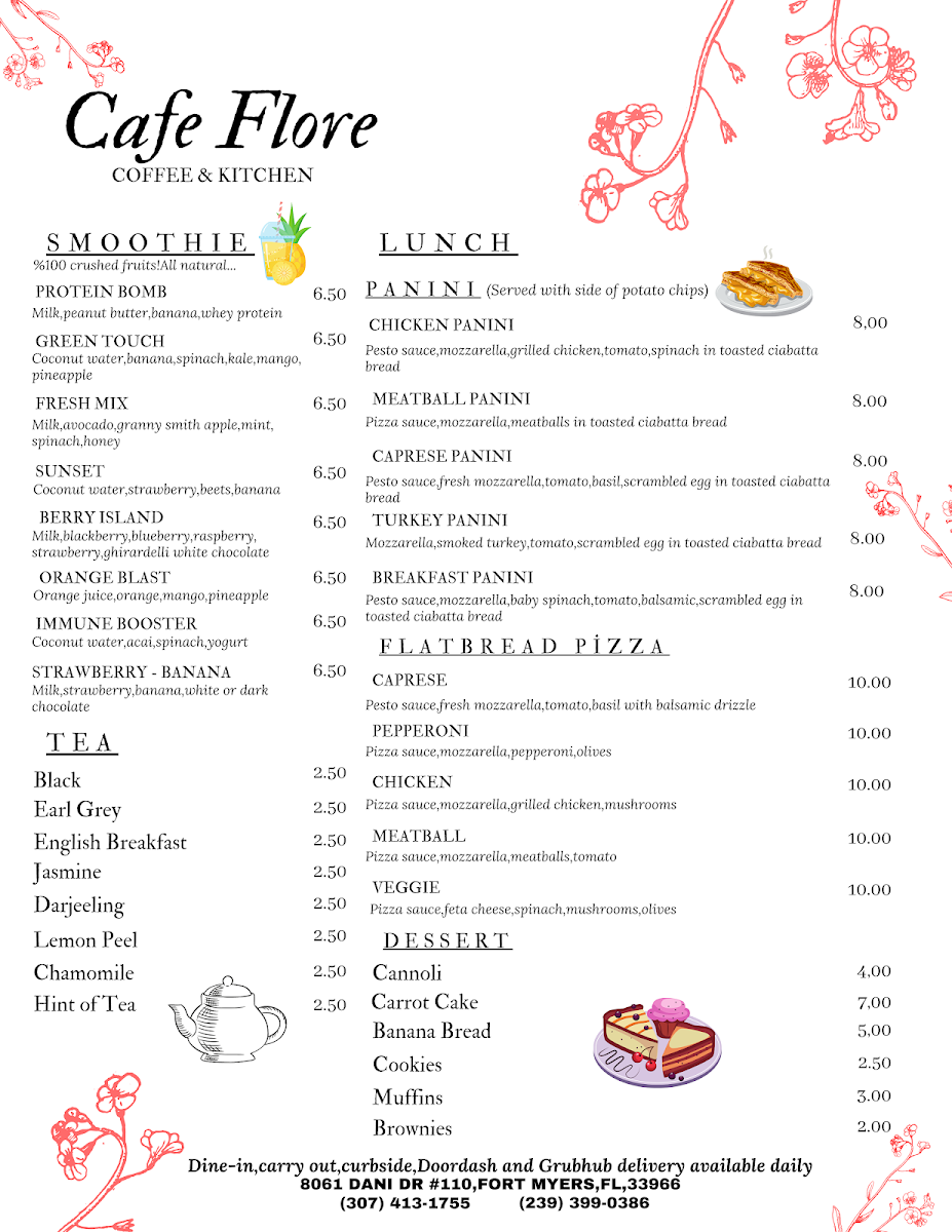 Introducing the menu of Cafe Flore, a charming cafe located at 8061 Dani Dr Unit 110, Fort Myers, FL, where delightful flavors meet inviting ambiance. Renowned for its special coffee drinks, each beverage is crafted with care. Indulge in the Mocha Frappe or the rich Caramel Frappe, both topped with decadent drizzles that are sure to satiate your sweet cravings for just $6.50.